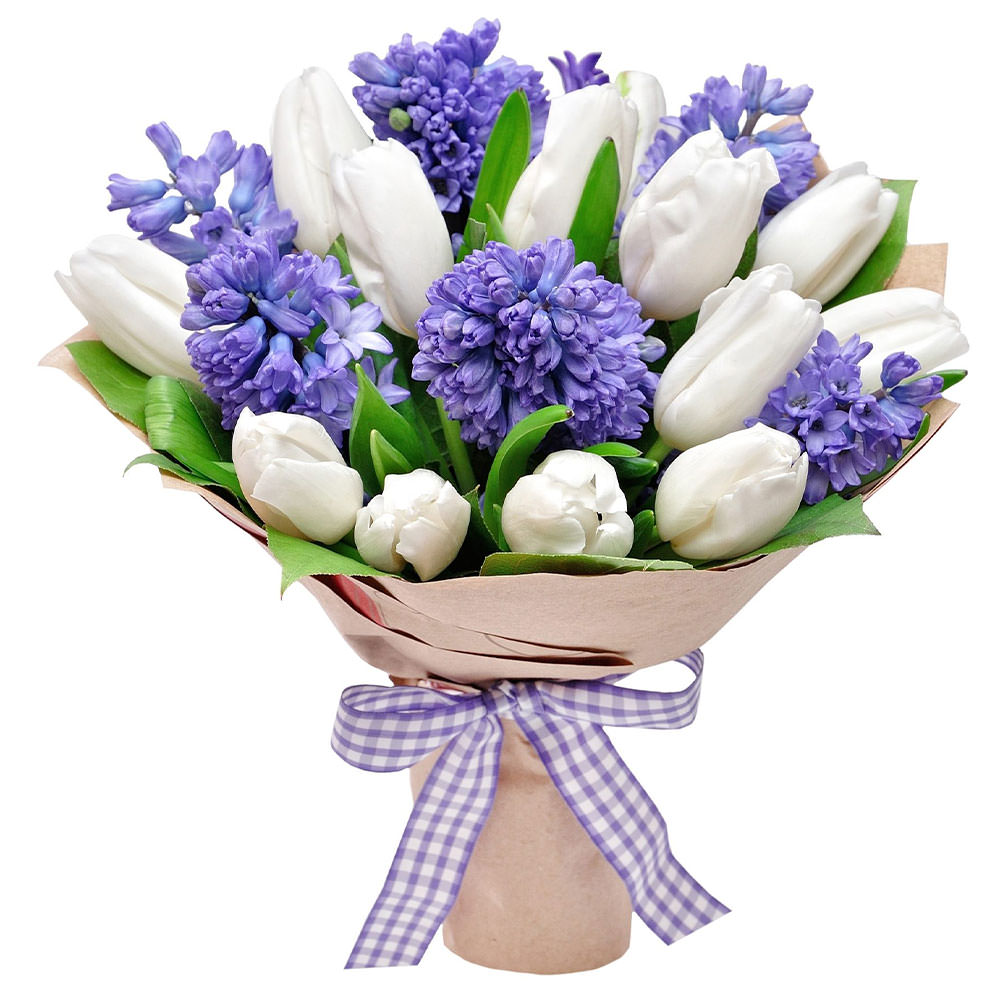 Тюльпан белый, гиацинт синий. Упаковка (лента, пленка, крафт, сетка, пленка матовая)