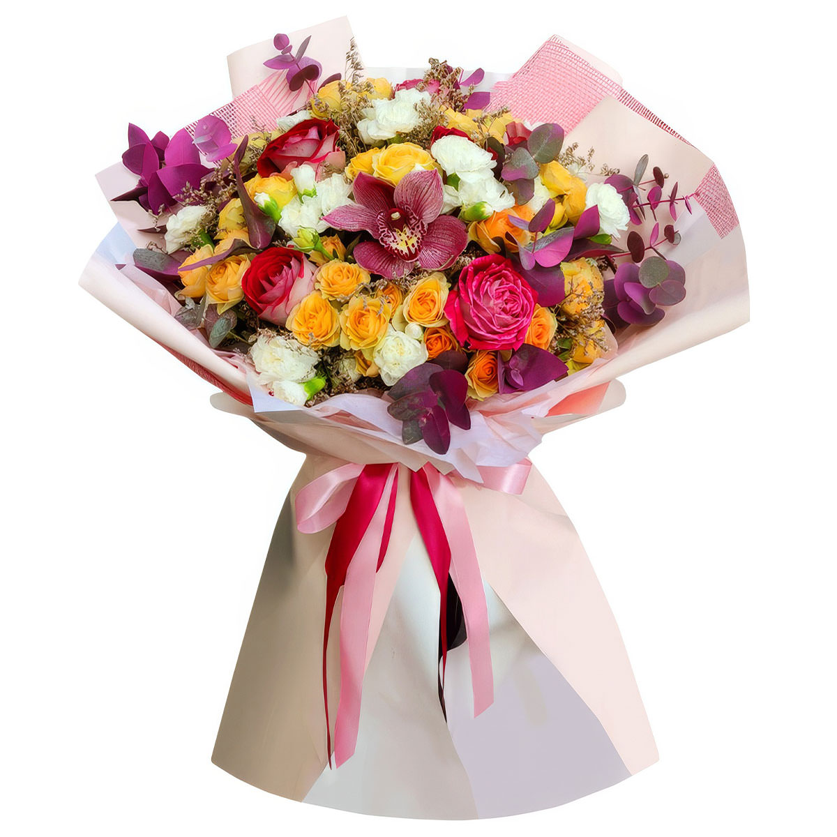 Орхидея розовая, роза кустовая желтая, роза одноголовая розовая, гвоздика мини белая, эвкалипт. Упаковка (лента, пленка, крафт, сетка, пленка матовая)