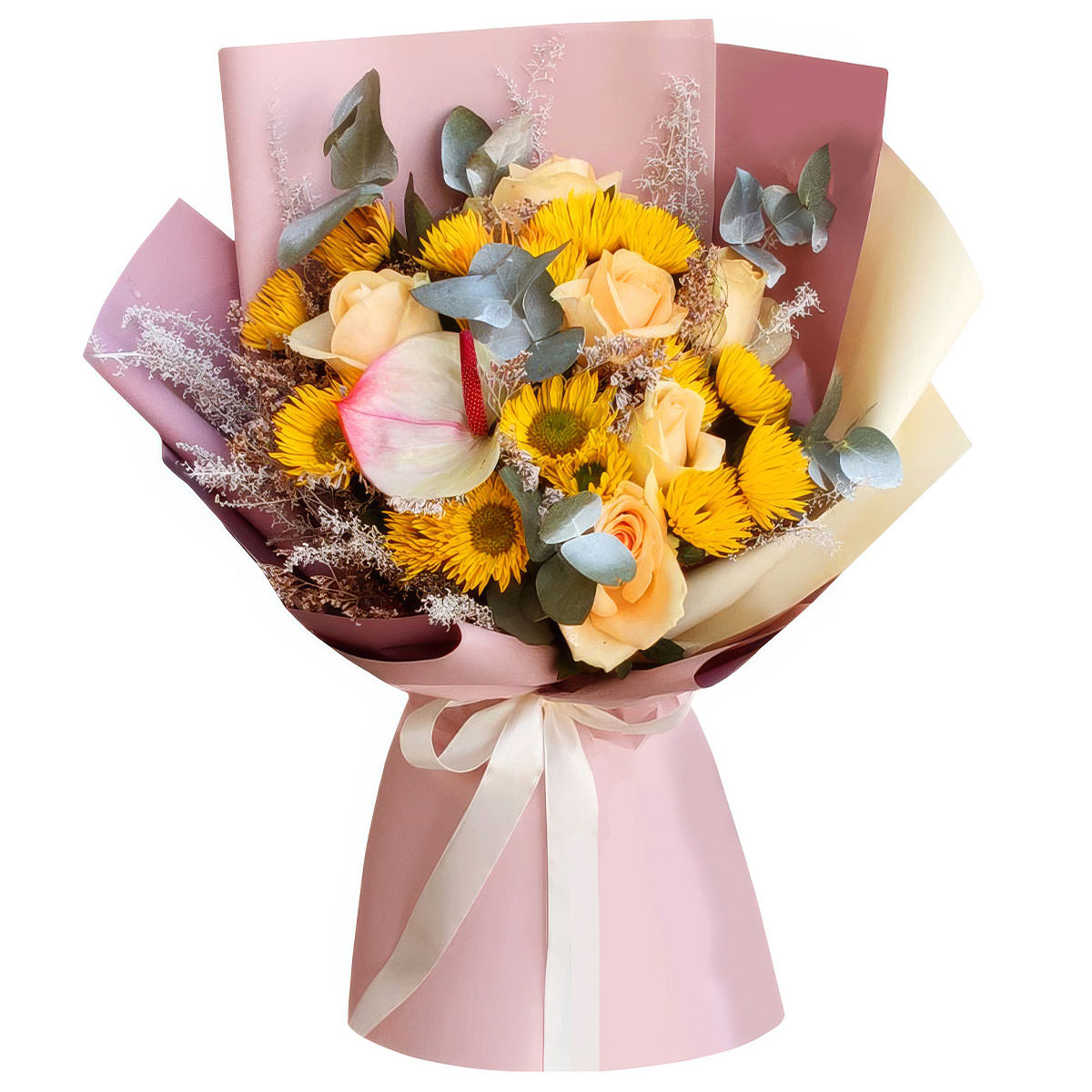 | Состав | Кустовые розы, Розы, Эвкалипт |