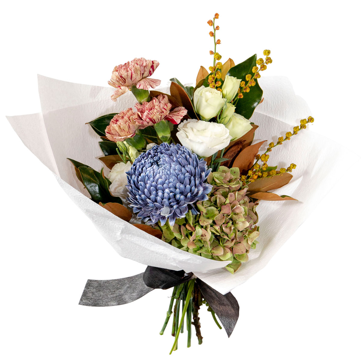 Гортензия зеленая, астра голубая, гвоздика паолетто, эустома белая, декоративная зелень. Упаковка (лента, пленка, крафт, сетка, пленка матовая)