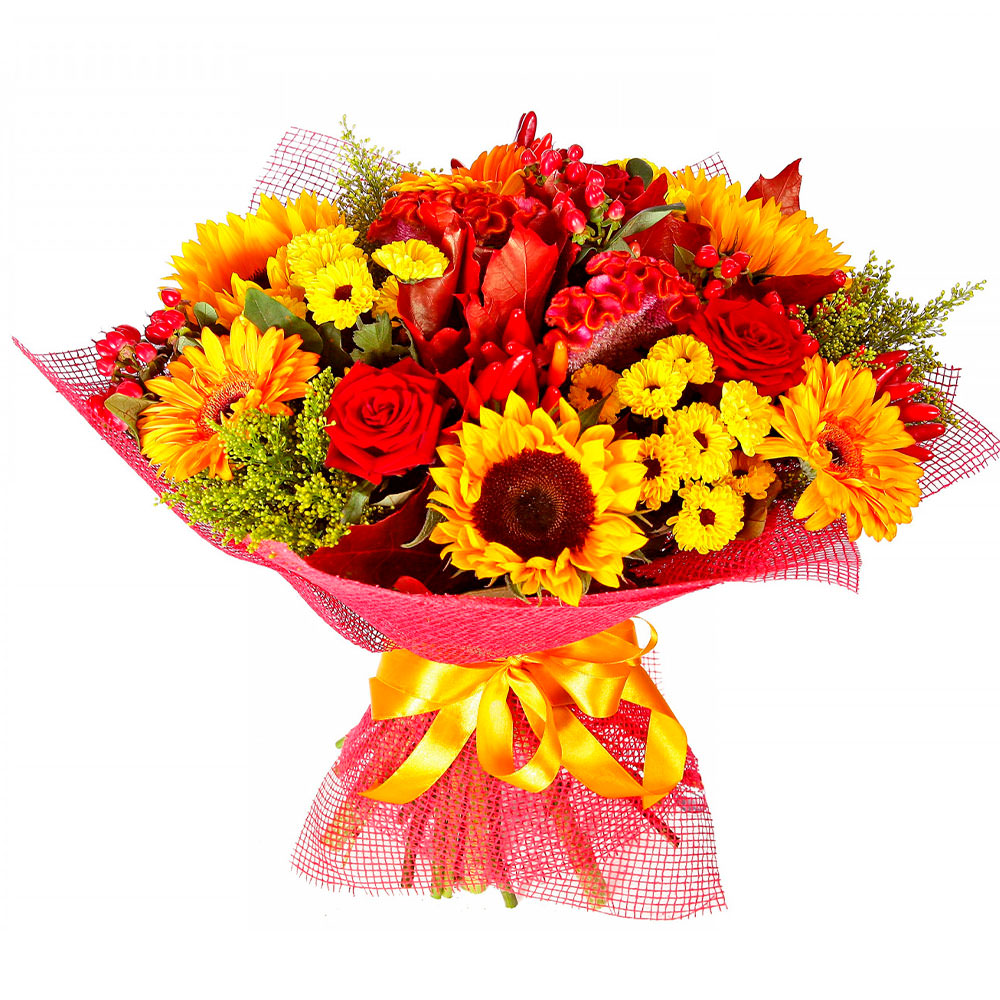 | Состав | Герберы, Подсолнухи, Розы, Хризантемы |