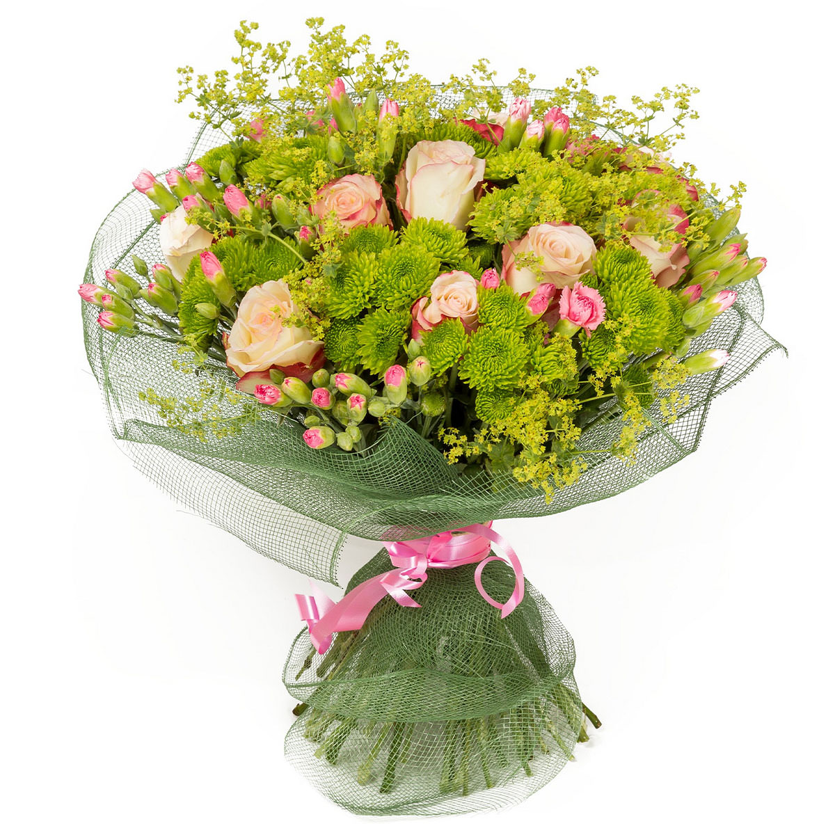 Роза одноголовая кремовая, хризантема кустовая зеленая, гвоздика кустовая розовая, зелень. Упаковка (лента, пленка, крафт, сетка, пленка матовая)