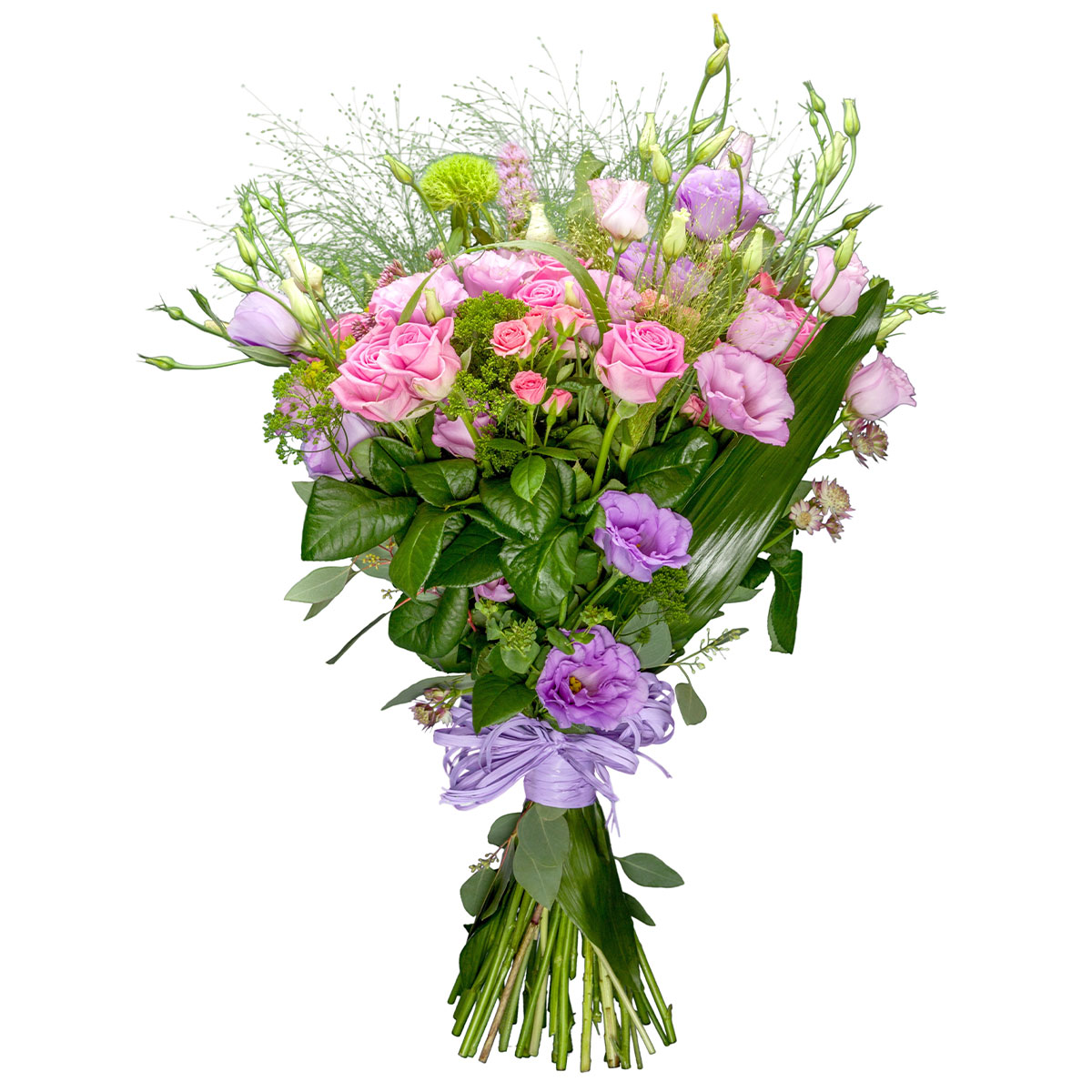 Роза кустовая розовая, эустома сиреневая, зелень аспидистра. Упаковка (лента, пленка, крафт, сетка, пленка матовая)