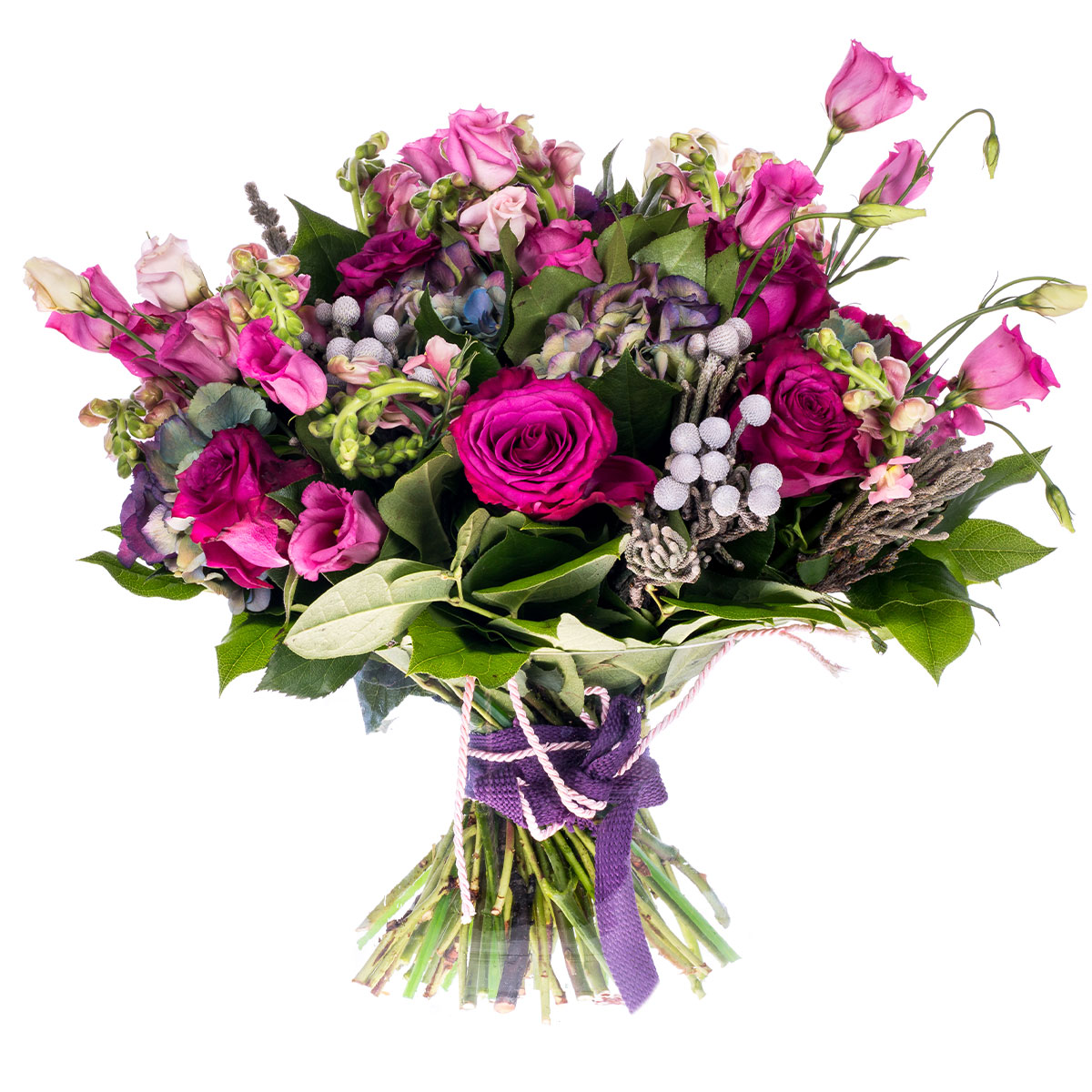 Гортензия фиолетовая, роза одноголовая розовая, эустома розовая, бруния, зелень. Упаковка (лента, пленка, крафт, сетка, пленка матовая)