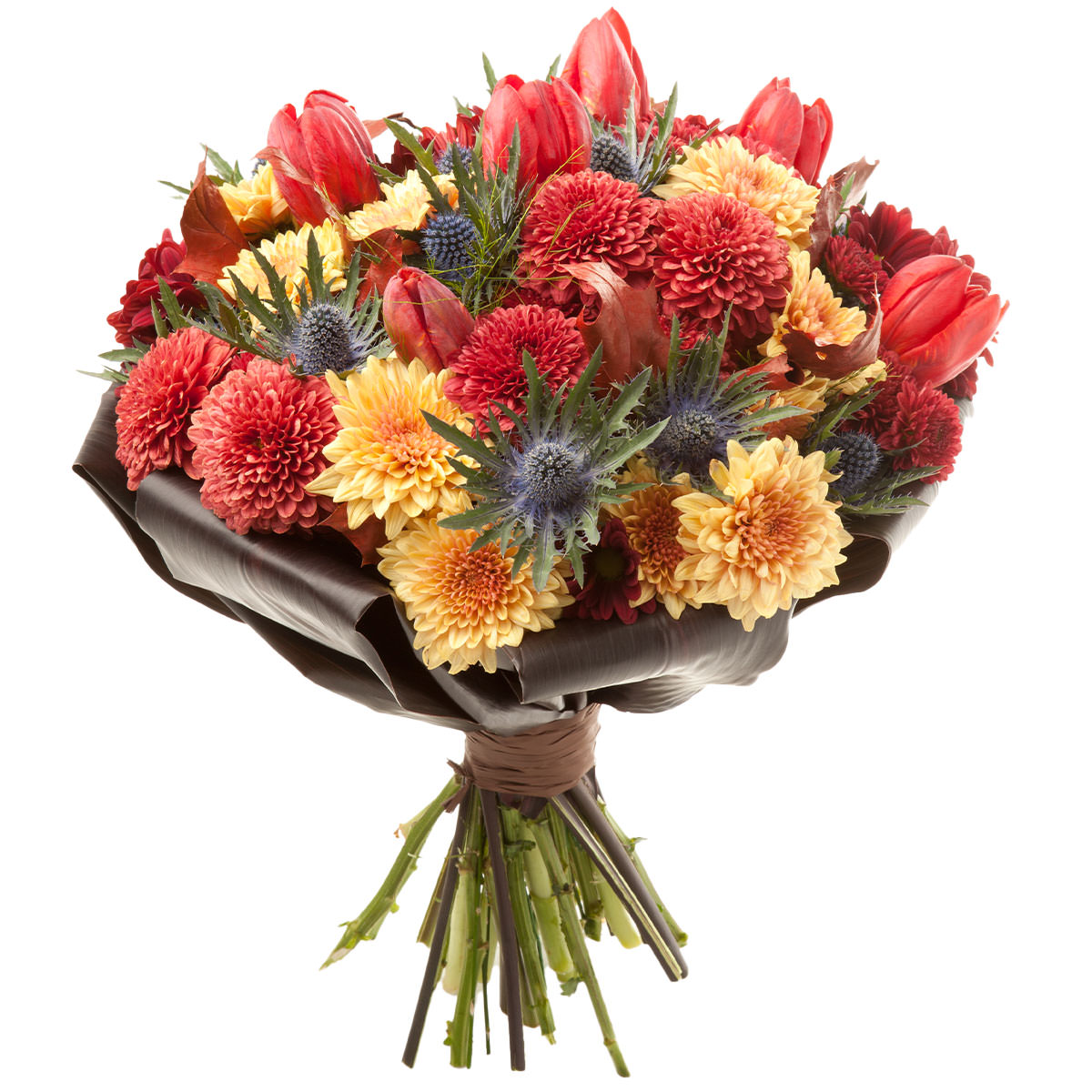 Эрингиум, тюльпан красный, хризантемы оранжевые и красные, аспидистра. Упаковка (лента, пленка, крафт, сетка, пленка матовая)