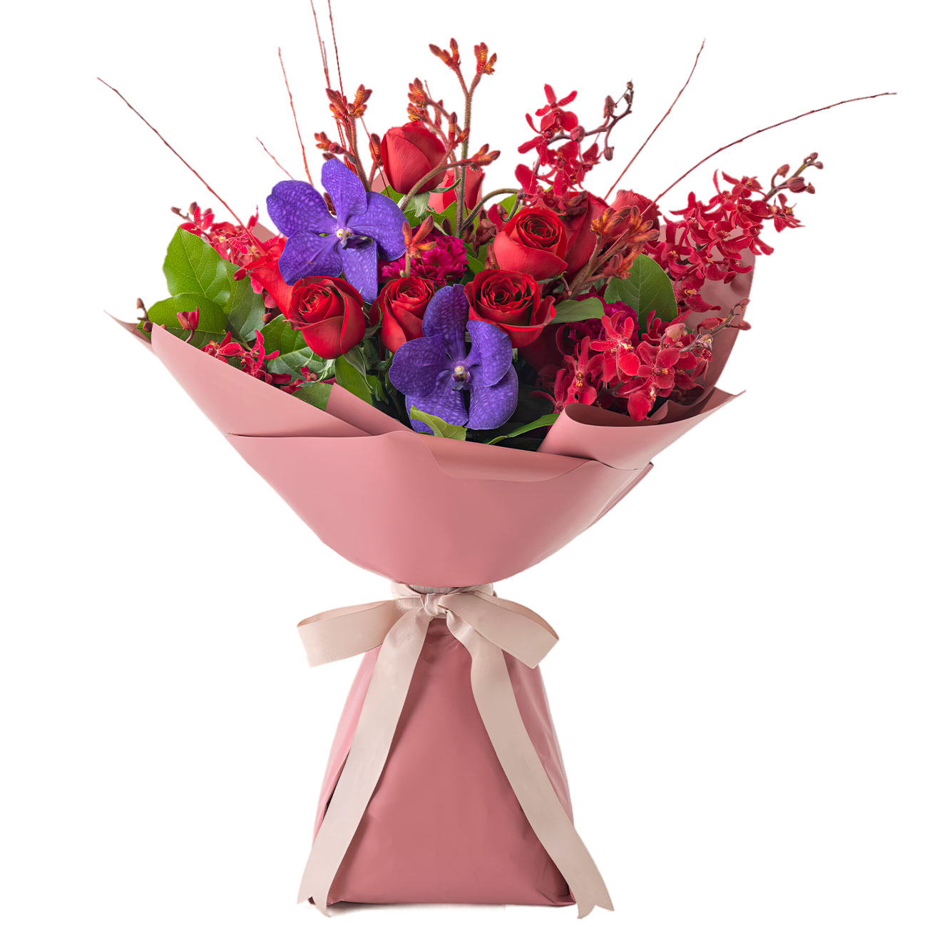 Роза кустовая красная кения, орхидея Ванда, азима, гвоздика розовая, цветущий кизил. Упаковка (лента, пленка, крафт, сетка, пленка матовая)