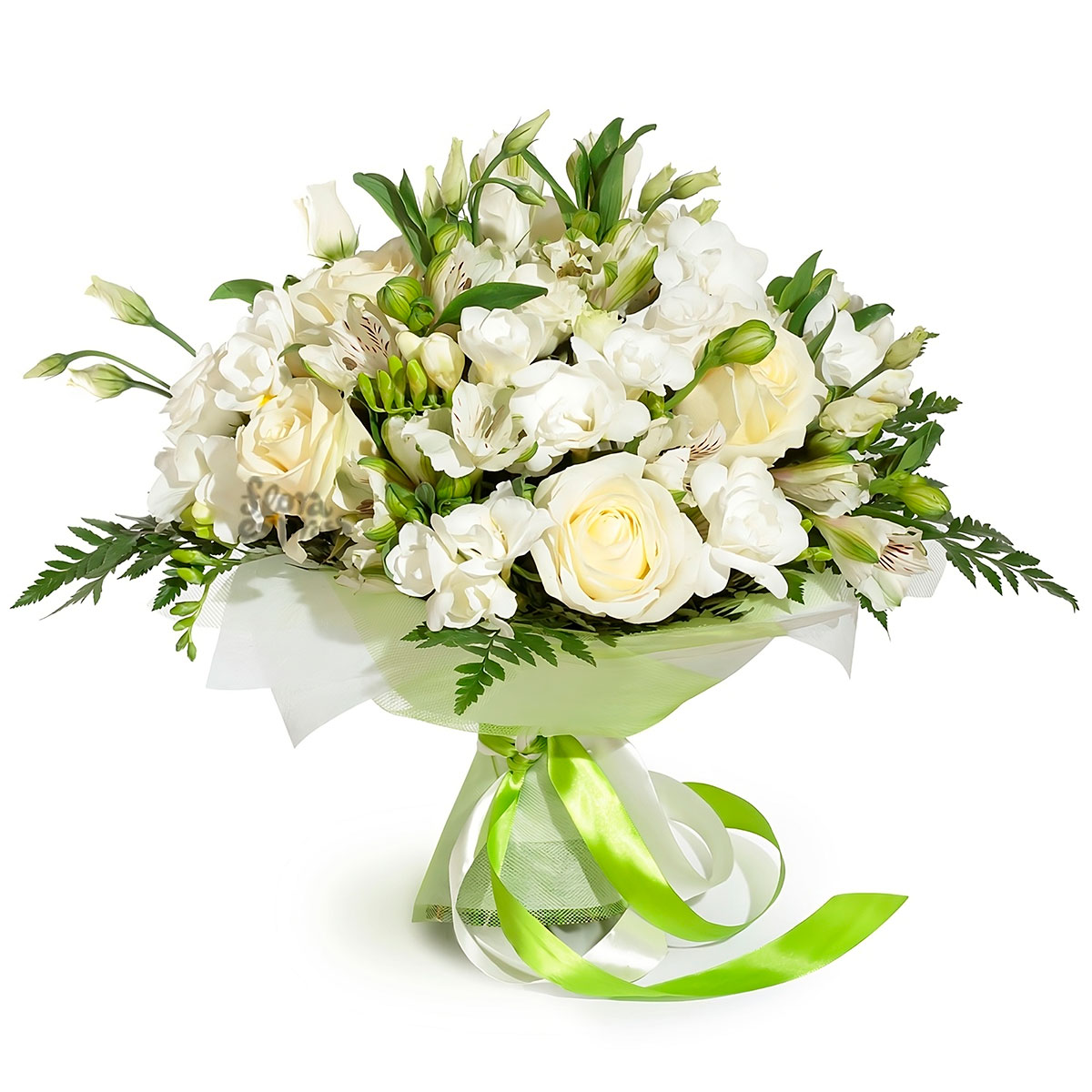 Фрезия белая, роза одноголовая белая, альстромерия белая, эустома белая, зелень. Упаковка (лента, пленка, крафт, сетка, пленка матовая)