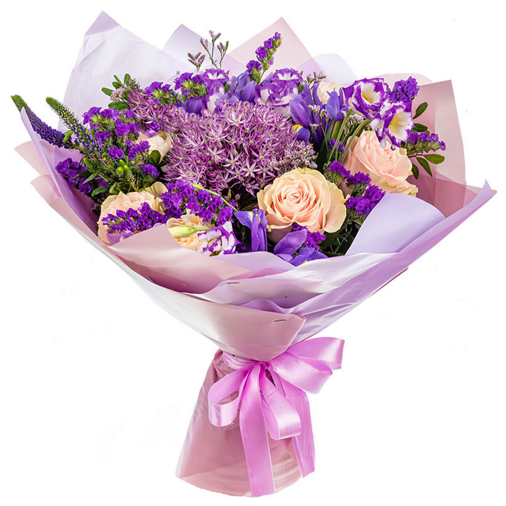 Роза одноголовая кремовая, ирис, эустома фиолетовая, статица, вероника, зелень. Упаковка (лента, пленка, крафт, сетка, пленка матовая)