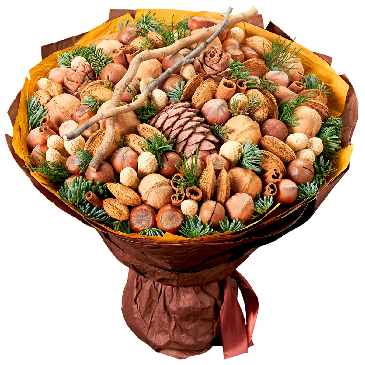 Орех грецкий, орех макадамия, фундук, арахис, корица, хвоя, шишки. Упаковка (лента, пленка, крафт, сетка, пленка матовая)