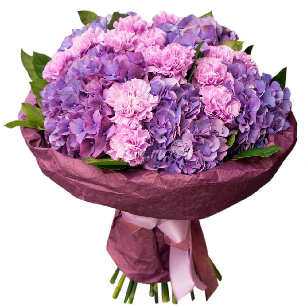 Гортензия фиолетовая, гвоздика сиреневая, зелень. Упаковка (лента, пленка, крафт, сетка, пленка матовая)