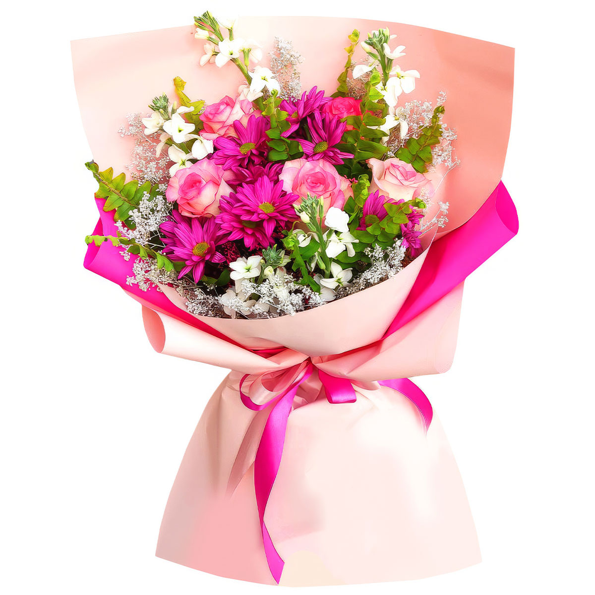 Роза одноголовая розовая, маттиола белая, хризантема кустовая розовая, сухоцветы. Упаковка (лента, пленка, крафт, сетка, пленка матовая)