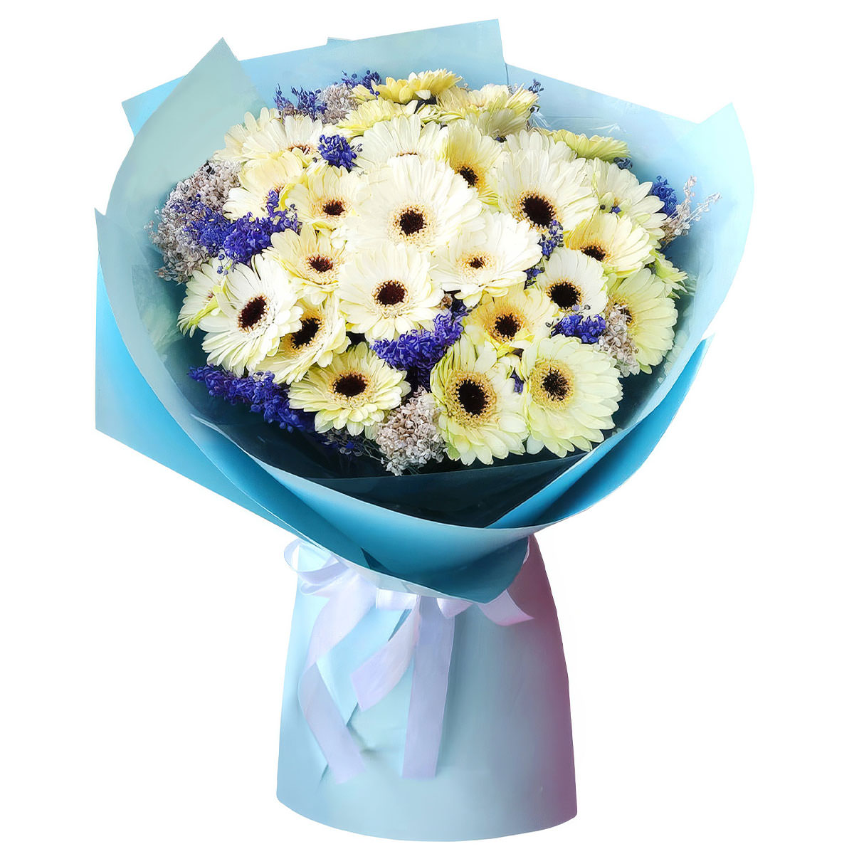 Гербера белая, сухоцветы. Упаковка (лента, пленка, крафт, сетка, пленка матовая)