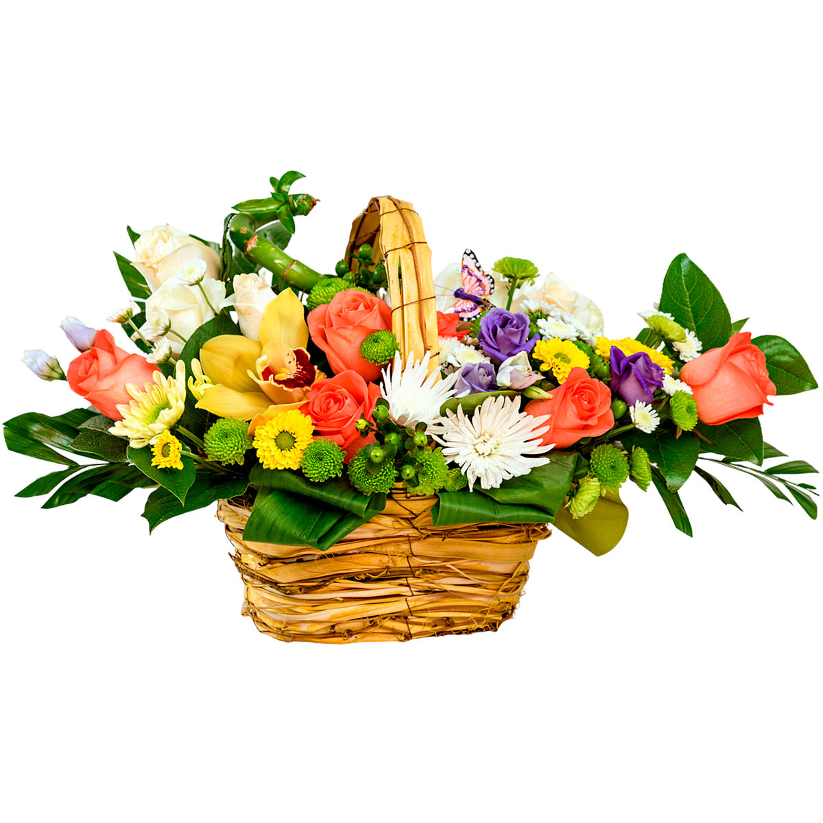 Роза одноголовая оранжевая, роза кустовая фиолетовая, орхидея желтая, хризантема желтая и зеленая, маргаритка белая, эустома, бамбук, гиперикум, аспидистра. Упаковка (Корзина, оазис, ящик).
