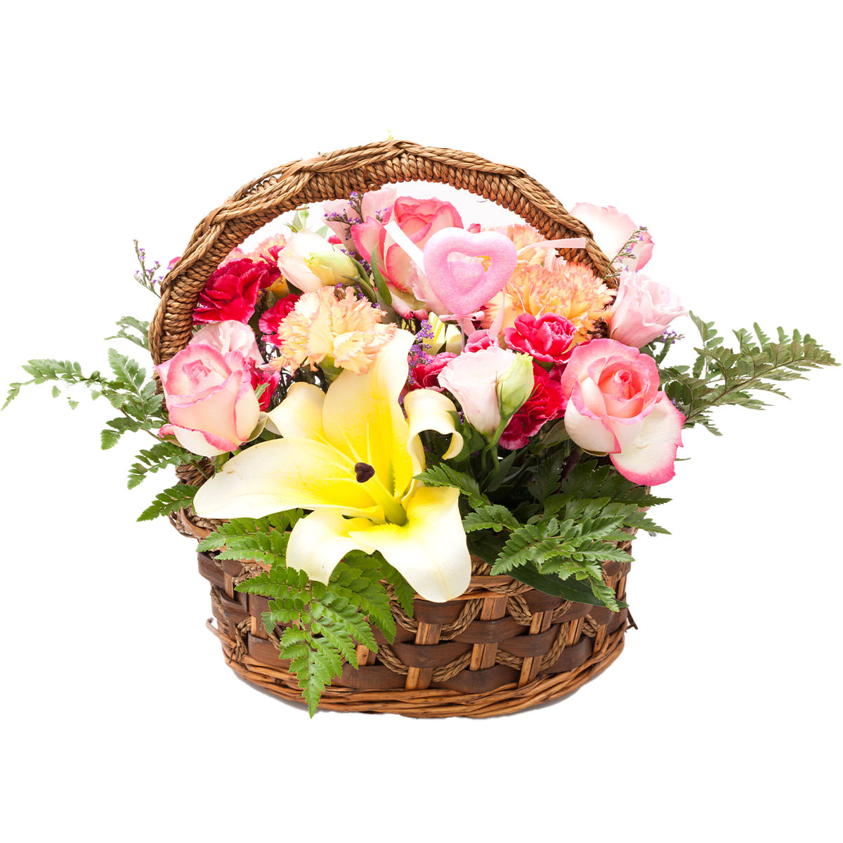Роза одноголовая розовая, лилия белая, гвоздика желтая и розовая, эустома кремовая, зелень. Упаковка (Корзина, оазис, ящик).
