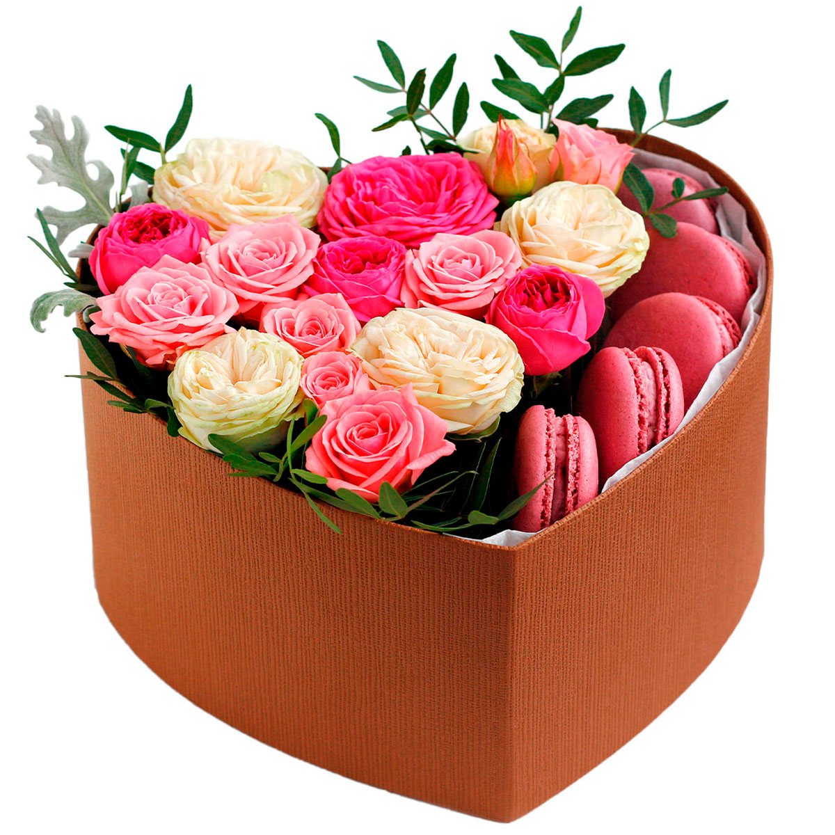 Роза пионовидная белая и розовая, роза кустовая розовая, фисташка, макарун. Упаковка (шляпная коробка, квадратный бокс, коробка сердце, оазис)