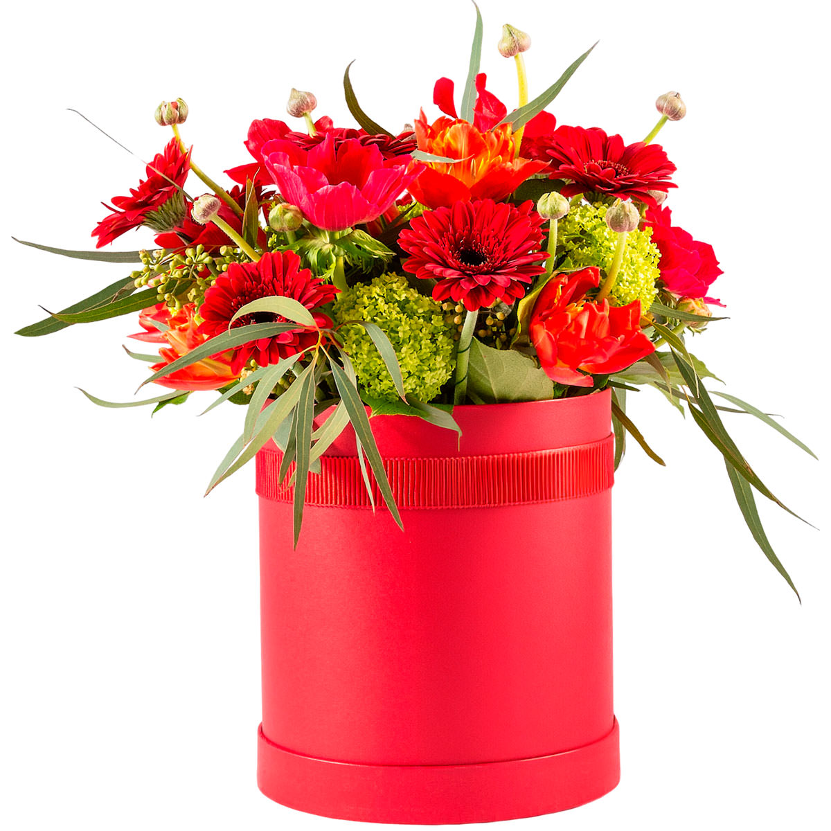Гербера красная, мак, эриогонум, эвкалипт. Упаковка (шляпная коробка, квадратный бокс, коробка сердце, оазис)