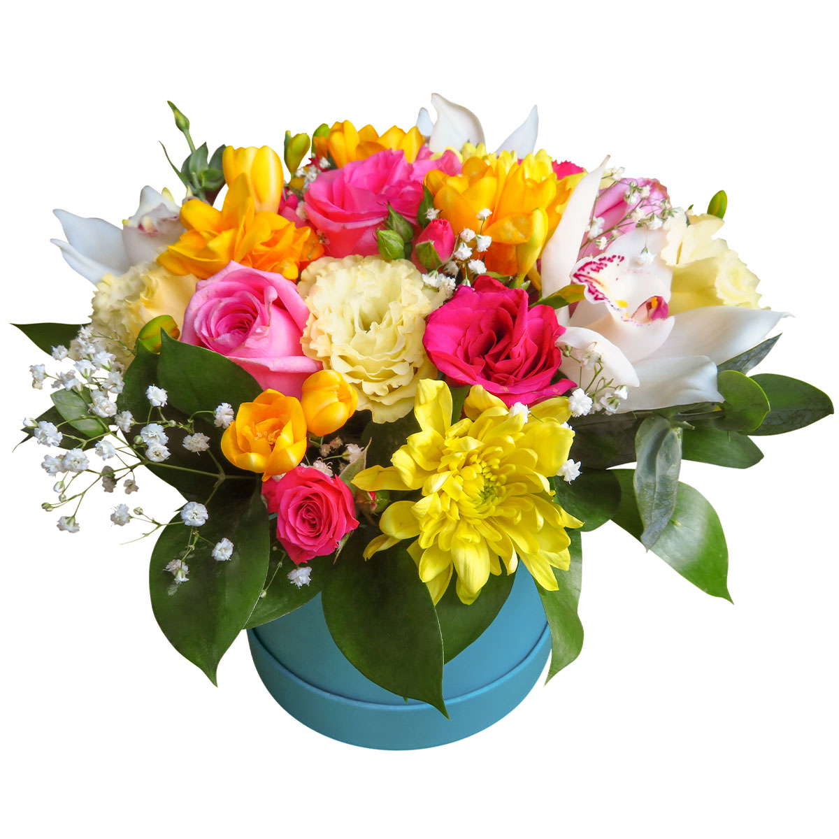 Роза одноголовая розовая, роза кустовая розовая, орхидея белая, хризантема кустовая желтая, фрезия желтая, эустома белая, аспидистра, гипсофила. Упаковка (шляпная коробка, квадратный бокс, коробка сердце, оазис)