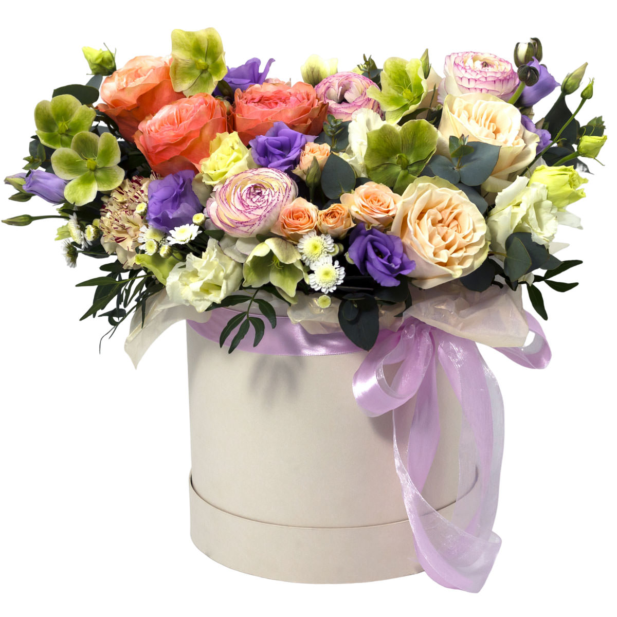Роза одноголовая кремовая и персиковая, роза кустовая персиковая, эустома белая и фиолетовая, ранункулюс Пикоти, морозник зеленый, хризантема кустовая мини белая, гвоздика кремовая, эвкаклипт. Упаковка (шляпная коробка, квадратный бокс, коробка сердце, оазис)